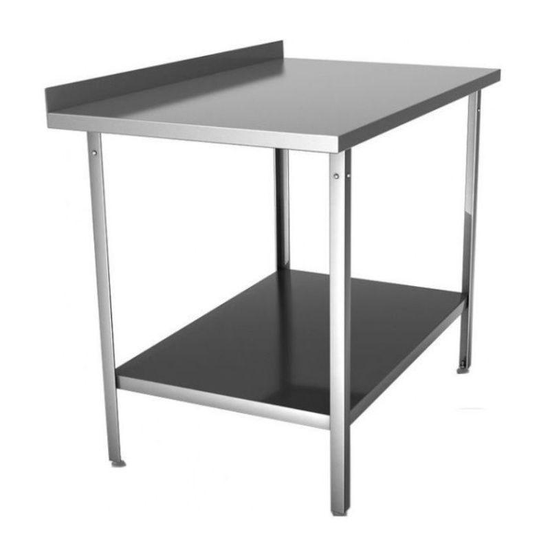 Стол из нержавеющей стали может изготавливаться с бортом (пристенный стол) и без борта (островной стол), так же доступны варианты по оснащению полкой: без полки (обвязка), решетчатая полка, сплошная полка.