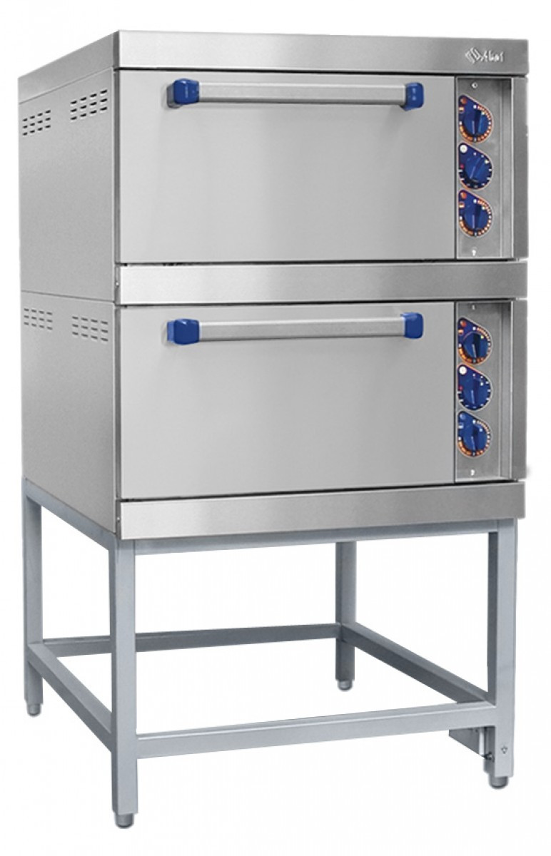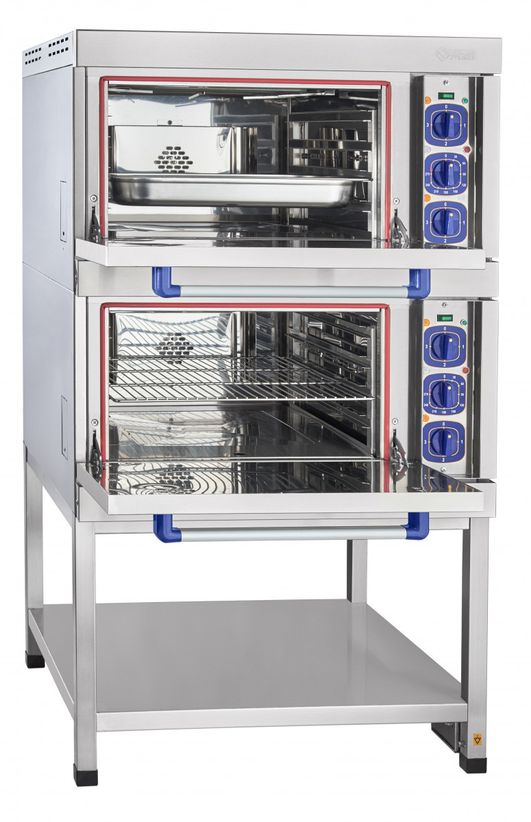 Каждая духовка укомплектована 2-мя гастроемкостями GN 1/1 размером 530x325x65 мм и одной решеткой размером 530x650x65 мм, изготовленными из нержавеющей стали. Раздельная регулировка мощности верхнего и нижнего блоков ТЭН-ов. Рабочий диапазон температуры 20-270°С, установленный аварийный терморегулятор предохраняет шкаф от перегрева свыше 320°С. Возможность принудительной конвекции и пароувлажнения. Все элементы конструкции, в том числе и сама рабочая камера, изготовлены из нержавеющей стали. Регулируемые по высоте ножки.